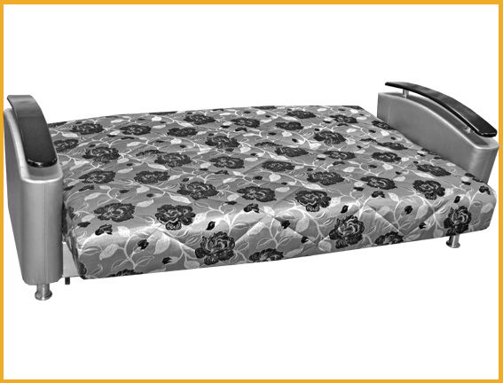 Современная стильная модель. Съемный чехол на спальном месте. Сиденье и спинка сформированы на основе металлокаркаса с деревянными латами, на котором закреплен мягкий мат, внутри которого располагается пружинный блок с настилом из термовойлока и листового пенополиуретана и соединены между собой трехпозиционным узлом трансформации. В коробчатом основании расположена емкость для хранения спальных принадлежностей. Диван оснащен декорированными гнутыми подлокотниками.Комплектуется декоративными подушками. Для трансформации требуется расстояния между стеной и диваном. Механизм раскладки "клик- кляк".