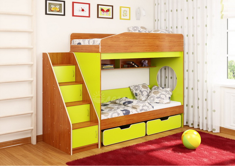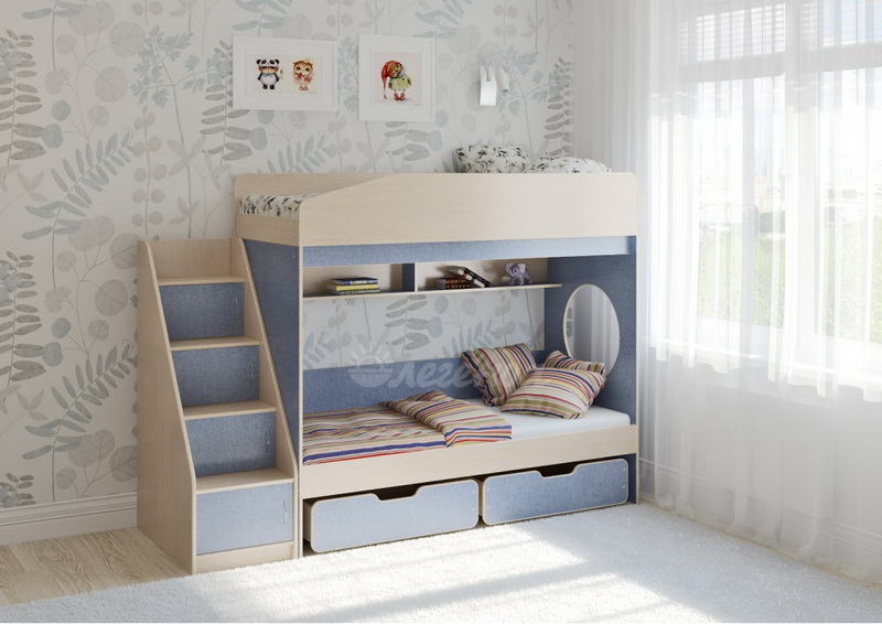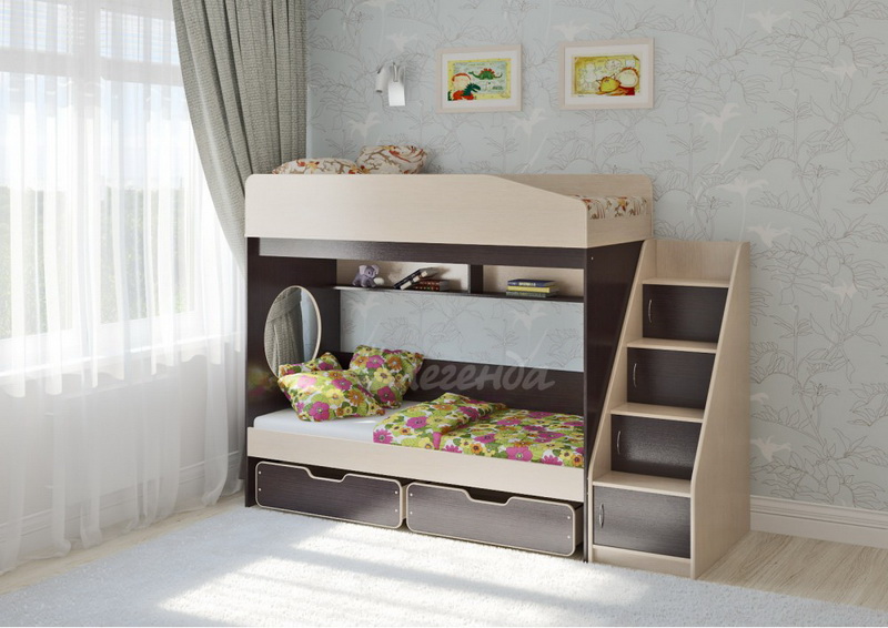 Над нижним спальным местом располагается встроенная двухсекционная полка, в которой удобно хранить книги, учебники, тетради, канцелярию и другие нужные вещи.