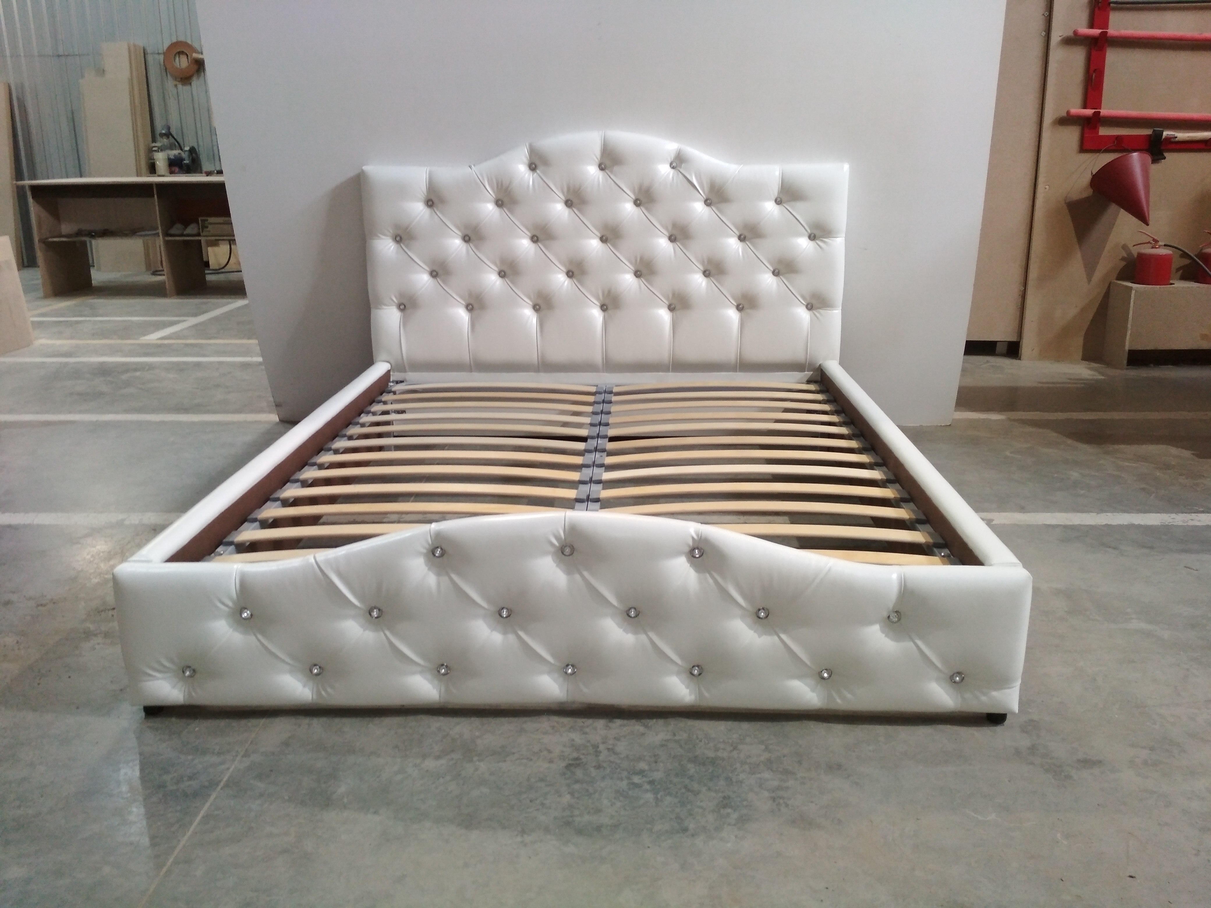 Особенности: Кровать установлена на пластиковые опоры h=25мм. Высота изголовья 1140 мм, изголовье каретная стяжка (пуговицы или стразы)