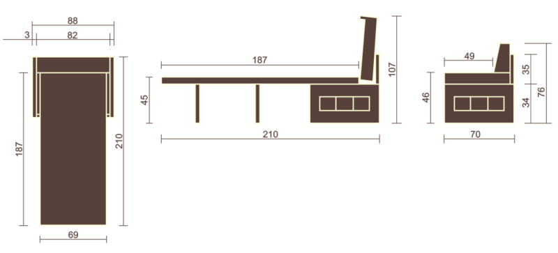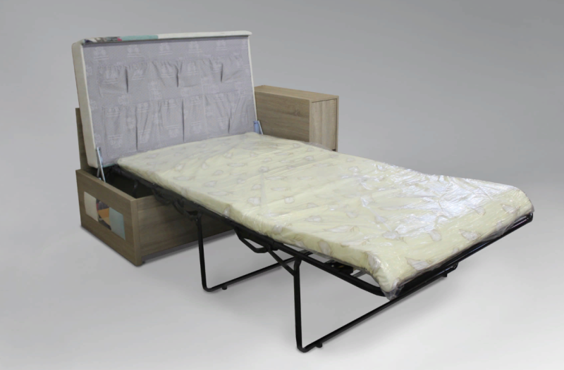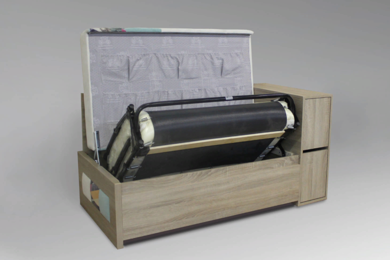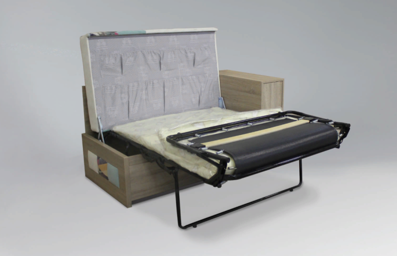 • Модель со спальным местом. Диван имеет механизм трансформации «французская раскладушка». Механизм трансформации весьма прост и требует минимальных усилий: достаточно снять подушку и поднять конструкцию сиденья, после чего установленный горизонтально механизм раскладушки, разворачивается и устанавливается на опорные ножки. При раскрытии спального места ножки автоматически раскладываются и жестко удерживаются в перпендикулярной полу позиции с небольшим наклоном вперед. Этот механизм трансформации напоминает разворачивание свитка и обеспечивает дивану компактность в сложенном виде и достаточно просторное спальное место в разложенном.