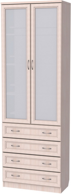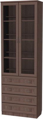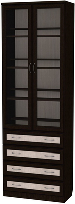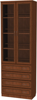 Нижняя часть шкафа оснащена четырьмя выдвижными ящичками. Аналогично, как и полки, ящики одинаковы по площади и высоте. В ящиках очень удобно хранить разнообразные мелочи, которые всегда нужны под рукой, а если шкаф будет установлен в спальной комнате, то в ящичках можно хранить постельное белье или одежду. Благодаря качественным современным механизмам, ящички легко скользят и открываются. Весь шкаф декорирован фурнитурой, воссоздающей классический стиль мебели, именно благодаря этому шкаф и будет прекрасным дополнением в любой комнате. Особенно выгодно использовать шкаф в комнате небольшого размера, поскольку, несмотря на свою вместительность, шкаф обладает действительно компактными размерами. Большой объем обеспечивается длинной и высотой шкафа.