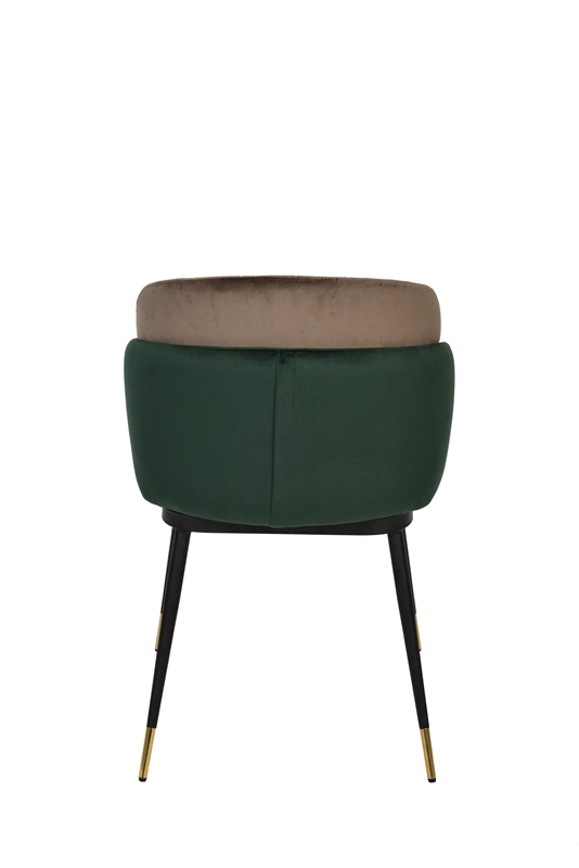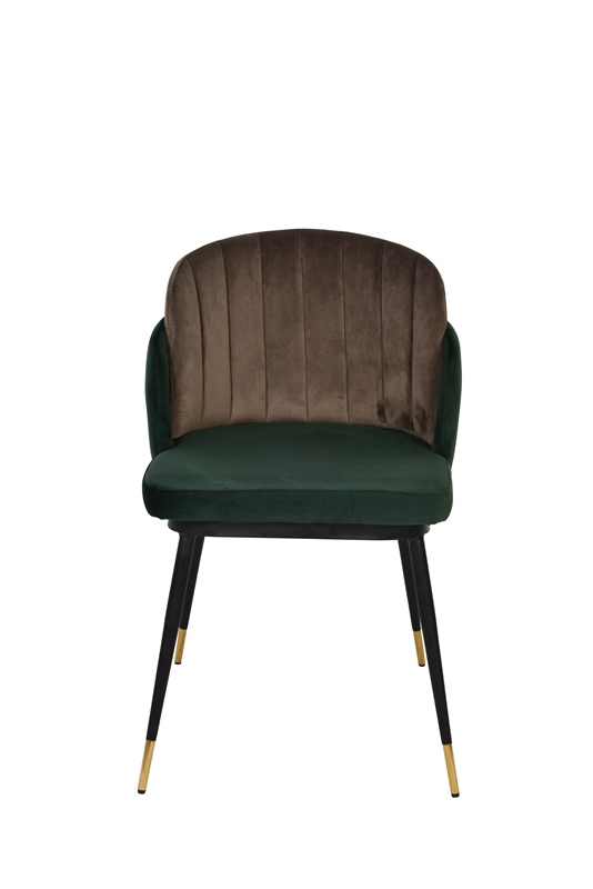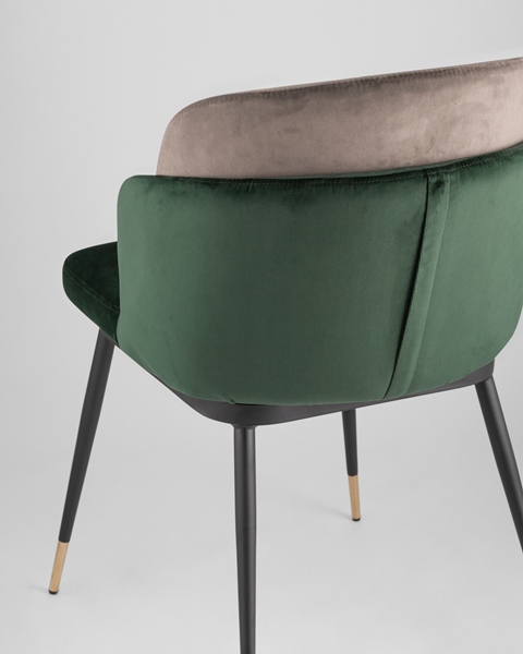 Мягкий двухцветный стул с обивкой из вельвета. Надежная опора достигается благодаря металлическому каркасу и удобным устойчивым ножкам, украшенным золотом. Спинка состоит из двух элементов, внутренняя часть с красивой вертикальной строчкой.